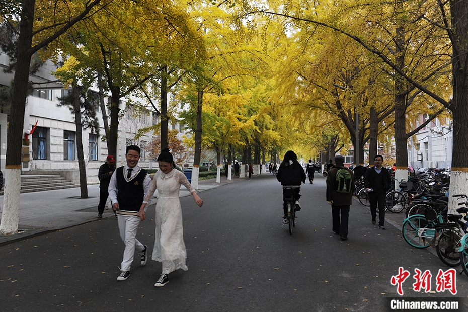除了公园、寺庙,一些高校也是观赏银杏景观的好去处。北京交通大学的银杏在众多的打卡点中虽然不那么有名,却别有一番静谧和青春的意味。漫步在思源楼前的满目金黄的银杏绿荫道上,看着年轻学生们在斜阳中往来穿梭,有一种秒回大学时光的感觉。中新网记者 李骏 摄