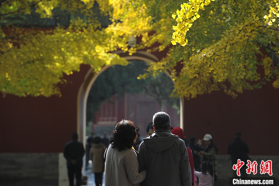 在秋意浸染的银杏树下携一人白首,又是另一番风味。中新网记者 李骏 摄
