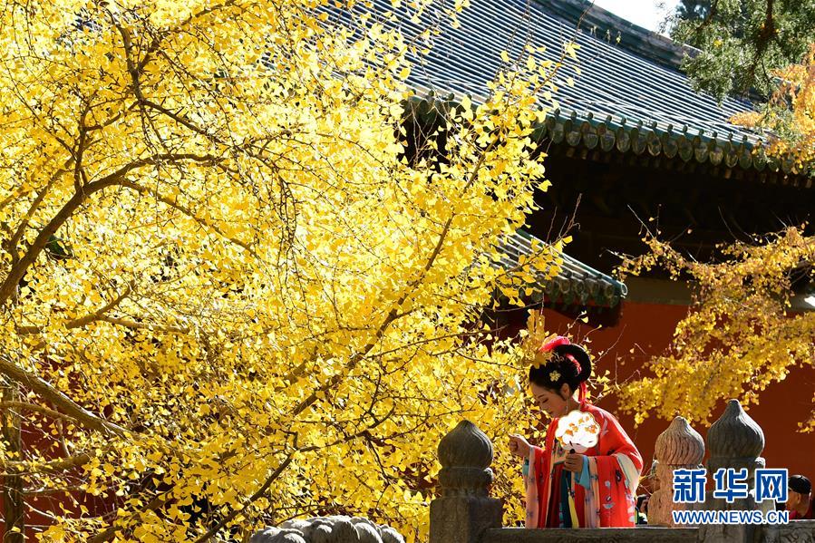 11月11日,一名汉服爱好者在大觉寺内的古银杏树旁留影。新华社记者 尹栋逊 摄