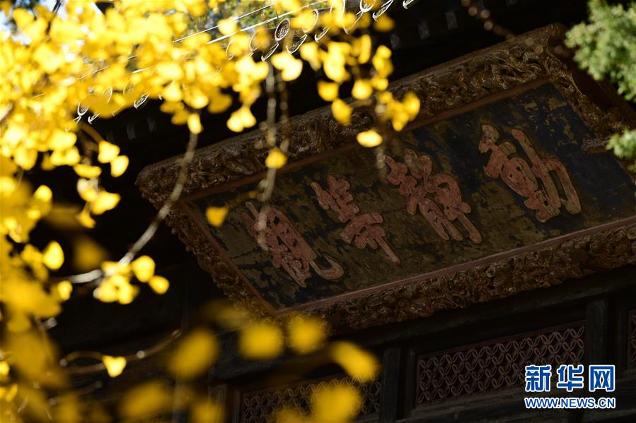 11月11日,大觉寺内的古银杏黄叶与大殿牌匾相映成趣。 新华社记者 尹栋逊 摄