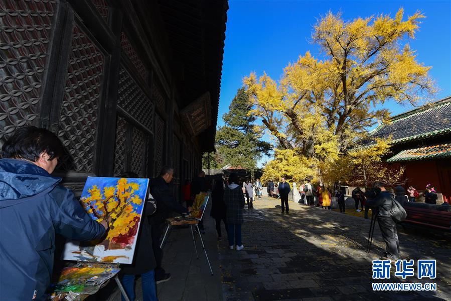 11月11日,绘画爱好者在大觉寺内的古银杏树旁写生。新华社记者 尹栋逊 摄