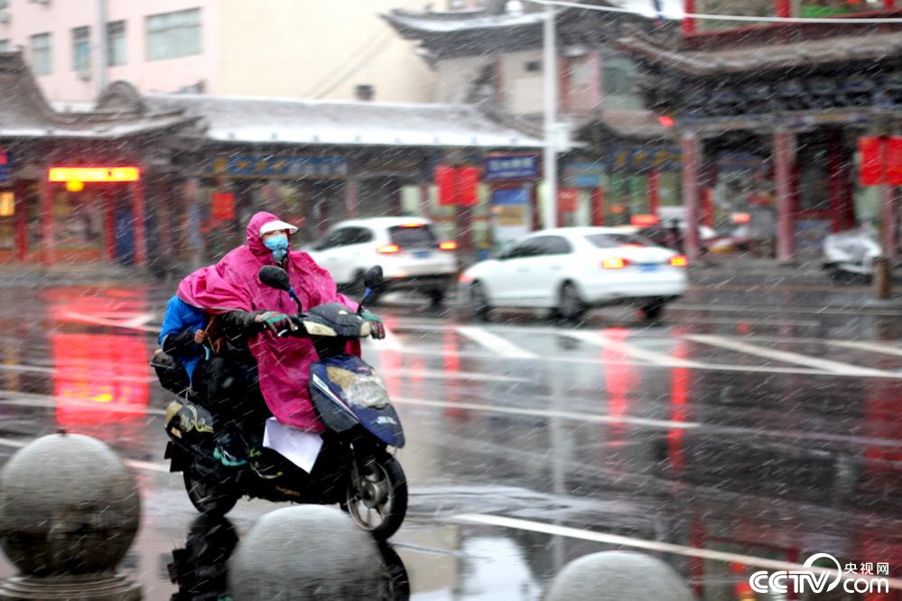 “双11”的羽绒服还未派单,11月最强冷空气却已到来,从11月12日到13日,甘肃张掖、酒泉、金昌、武威等地出现降雪天气。风雪中一位市民骑着电动车在甘肃张掖甘泉公园门口街道驶过。