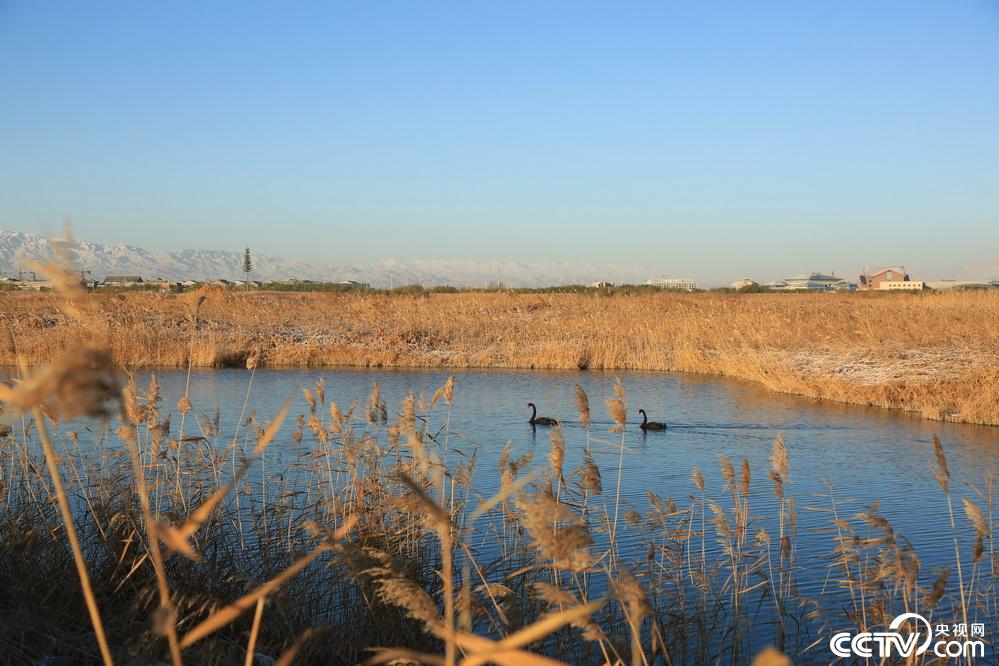11月13日,雪后的甘肃张掖国家湿地公园里金黄芦苇、湖中游荡的天鹅、远处的祁连雪峰构成冬日旖旎风光。图中远处为祁连山。(图片均由陈礼摄)