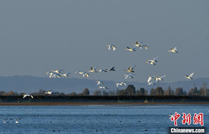 近日,甘肃省张掖市黑河湿地国家级自然保护区高台段的马尾湖库区迎来了迁徙到此越冬的大天鹅。 郑耀德 摄
