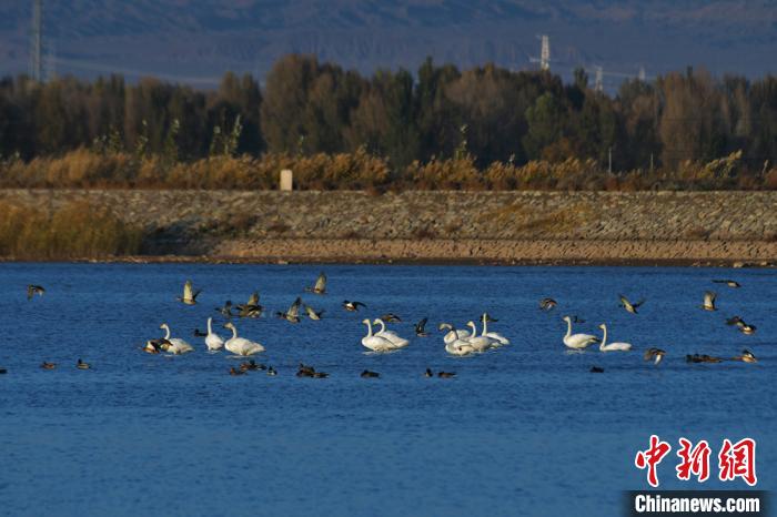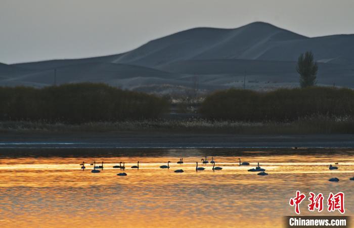 甘肃戈壁湿地初冬暖阳洒湖面 天鹅觅食戏水中