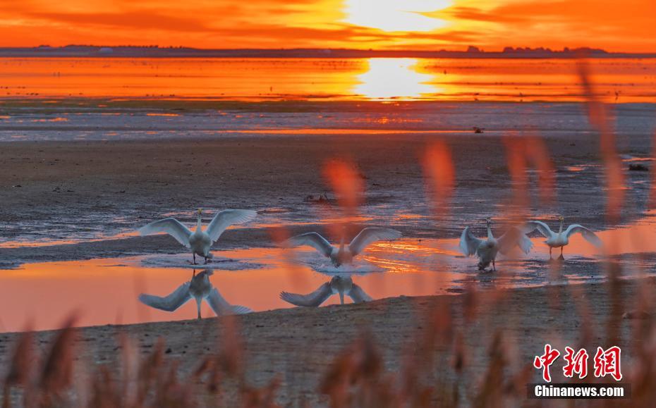 近日,摄影师在山东荣成天鹅湖畔拍摄到“天鹅舞朝晖”美景。美丽的大天鹅伴着朝霞,或沐浴梳洗,或展翅飞翔。每年11月,成千上万只从西伯利亚等地远道而来的大天鹅陆续飞抵山东荣成越冬,并于来年3月上旬回迁。近年来荣成先后实施了天鹅湖清淤和生态修复工程等,守护远方的“贵客”。李信君 摄