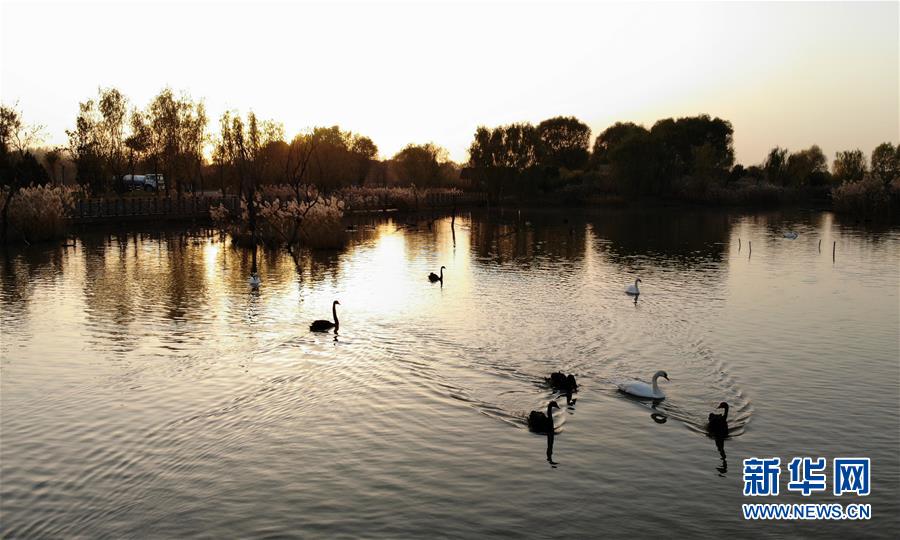甘肃戈壁湿地初冬暖阳洒湖面 天鹅觅食戏水中