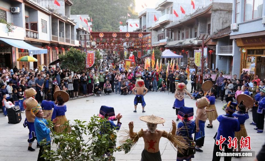 壮族田间矮人舞是靖西市代表性的民间舞蹈之一,具有鲜明的民族特色、生动的演绎形式、淳朴的艺术风格和深厚的文化底蕴,主要流传于靖西市安德镇大村屯,至今已有900多年的历史。关于靖西壮族田间矮人舞的来源,当地主要流传着两种说法:一是壮族民众的酬神祭田仪式;二是老百姓即兴编创的民间舞蹈。田间矮人舞是“服饰——道具——动作——歌曲”四者兼具且和谐统一的民间舞蹈。每年秋收时节,在田间劳作间隙,小伙子们将上衣脱下系于腰间,用田间的黑、红泥巴分别在肚皮上描绘出人的眉眼及唇舌,接着将竹箩套在头上,将两手臂张开,以肚皮为面部、以头上竹箩为帽子、以手臂为辨子的“矮人”形象即塑造完成。姑娘则面罩竹衣片、头戴斗笠、腰系稻草裙,模拟田间的“稻草人”。“矮人”主要舞蹈动作有“翘腿互斗”、“厥臀互撞”、“低头互顶”等,另外还通过呼吸变换控制肚皮,以丰富“矮人”的“面部”表情;“稻草人”则手拿竹篾拍击,配合“矮人”动作节奏哼唱当地民间小曲“马落禄扣鹫”。现场气氛欢快而活跃,舞者互相逗趣,尽情欢跳,喜庆丰收。图为11月初,当地民众表演田间矮人舞。中新社记者 任海霞 摄
