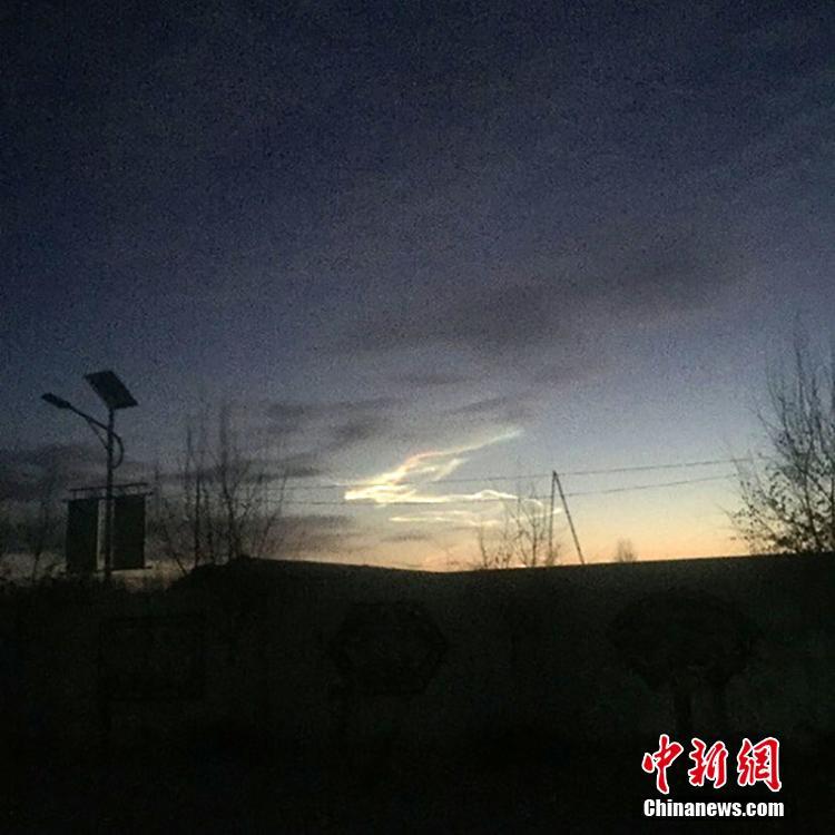 11月19日,位于甘肃河西走廊中段的张掖市高台县天空出现七彩朝霞。丝绸般的云彩飘浮在天际,闪着金光,绚烂而多彩,随着太阳升起,七彩朝霞渐渐退去。杨丽雲 摄