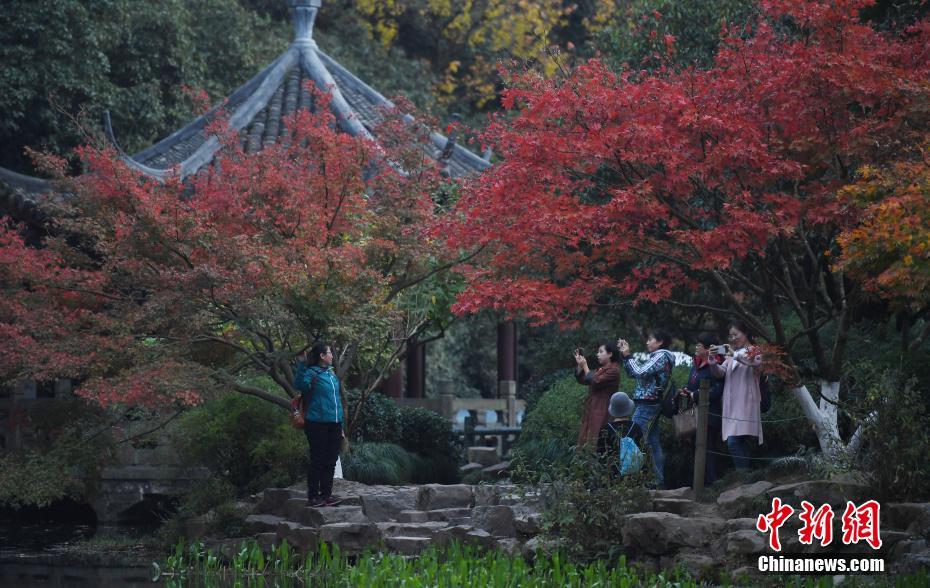 11月20日,游客在西湖九溪拍照。近日,浙江杭州西湖景区层林尽染,如画美景惹人醉。中新社记者 王刚 摄