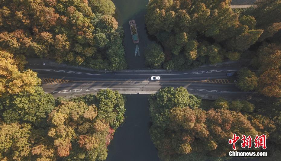 11月20日,航拍西湖杨公堤。近日,浙江杭州西湖景区层林尽染,如画美景惹人醉。中新社记者 王刚 摄