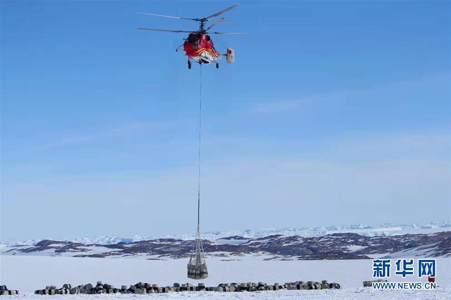 直升机将货物从“雪龙”号上调运至内陆出发基地(11月23日摄)。新华社记者 刘诗平 摄