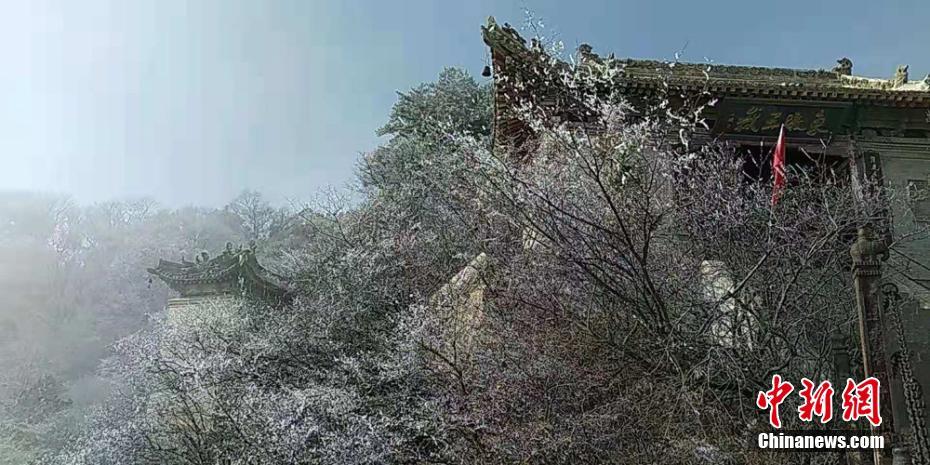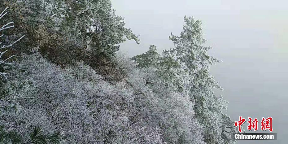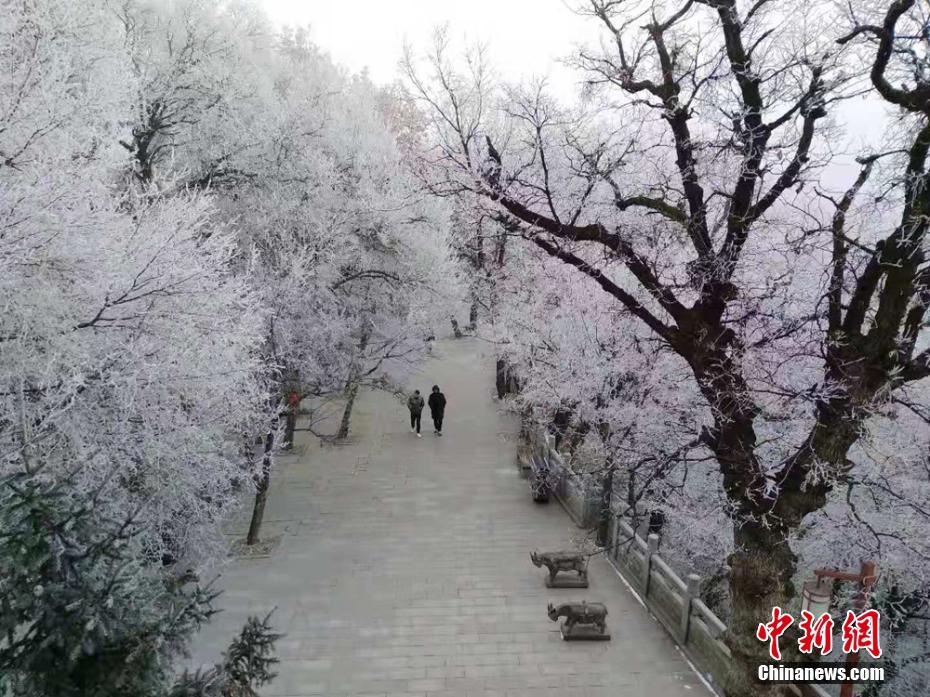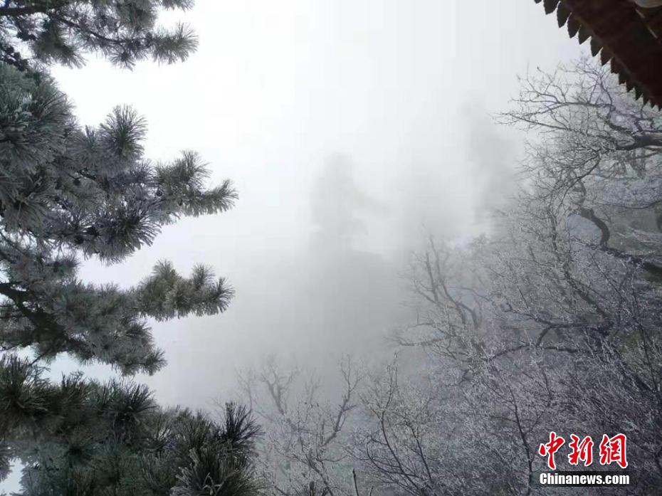 11月26日,甘肃平凉市崆峒山出现雾凇景观,玉树琼枝装点连绵群山,仿若走进童话世界。图为甘肃平凉市崆峒山出现雾凇景观。 徐振华 摄
