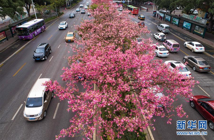 这是美丽异木棉花竞相绽放的广西柳州市东环大道(12月1日无人机拍摄)。 初冬时节,广西柳州市区东环大道、桂柳路等多条道路旁的1万多株美丽异木棉进入花期,竞相绽放的红色花朵将城市装扮得格外美丽。 近年来,广西柳州对城市进行花化、彩化、香化,着力打造生态花园城市景观。 新华社记者 黄孝邦 摄