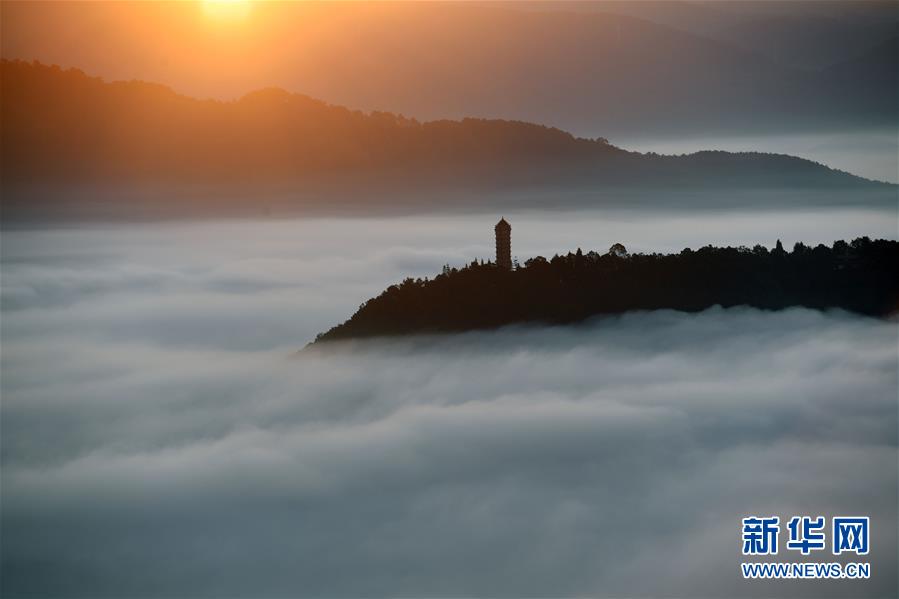 霞光中的的云南省普洱市宁洱县城云海(12月1日摄)。 冬季里,云南省普洱市宁洱县城云雾飘渺,呈现出云海景观,令游人流连忘返。 新华社记者杨宗友摄