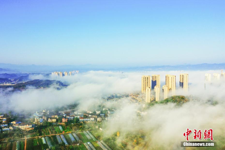 翻滚的云海让高楼和远山若隐若现。刘亚靖 摄