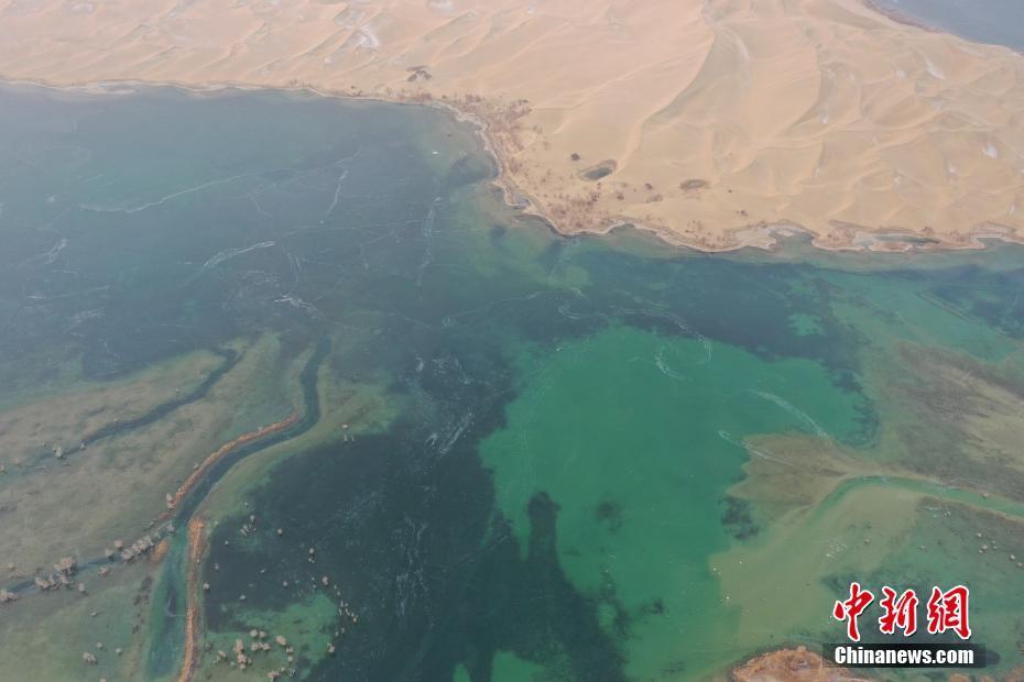 近日,位于新疆巴音郭楞蒙古自治州尉犁县的罗布湖,湖水已冻结,呈现出美丽的翡翠色,与塔克拉玛干沙漠、天然胡杨相映成趣。罗布湖约有2万亩水域,水质优良,渔业资源丰富。中新社发 仲雁铭摄 图片来源:CNSPHOTO