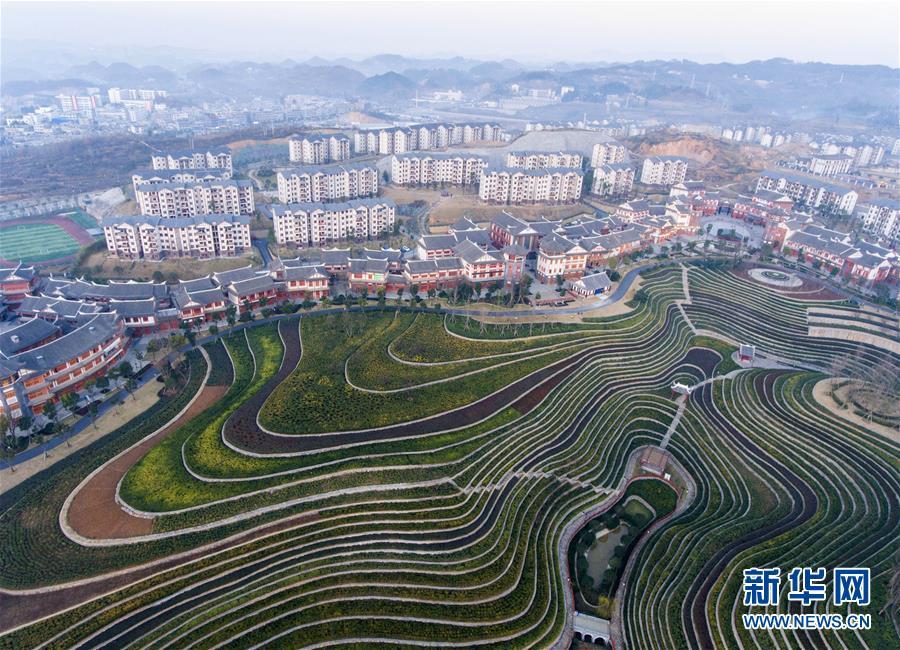 12月16日无人机拍摄的贵州省大方县奢香古镇“城市梯田”景观。寒冬时节,贵州省毕节市大方县奢香古镇的“城市梯田”绿意盎然,层层叠叠、线条分明。大方县奢香古镇是该县易地扶贫搬迁安置区,近年来在规划时把田园风光带入城镇建设,在古镇中心建设了12万平方米的“城市梯田”,种植观赏茶树、玫瑰花等观赏类植物,既扮靓了移民小区,又美化了城镇。新华社记者 杨文斌 摄