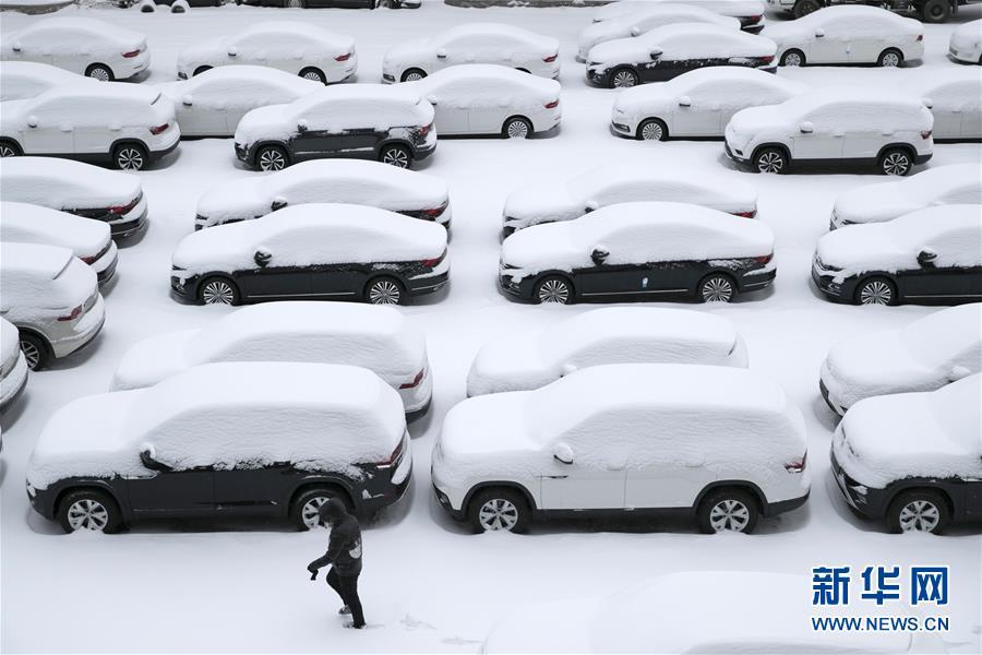 12月17日,一名市民走过哈尔滨市会展中心体育场附近的停车场。 当日,雪后的哈尔滨呈现出别样的景致。 新华社发(张涛 摄)
