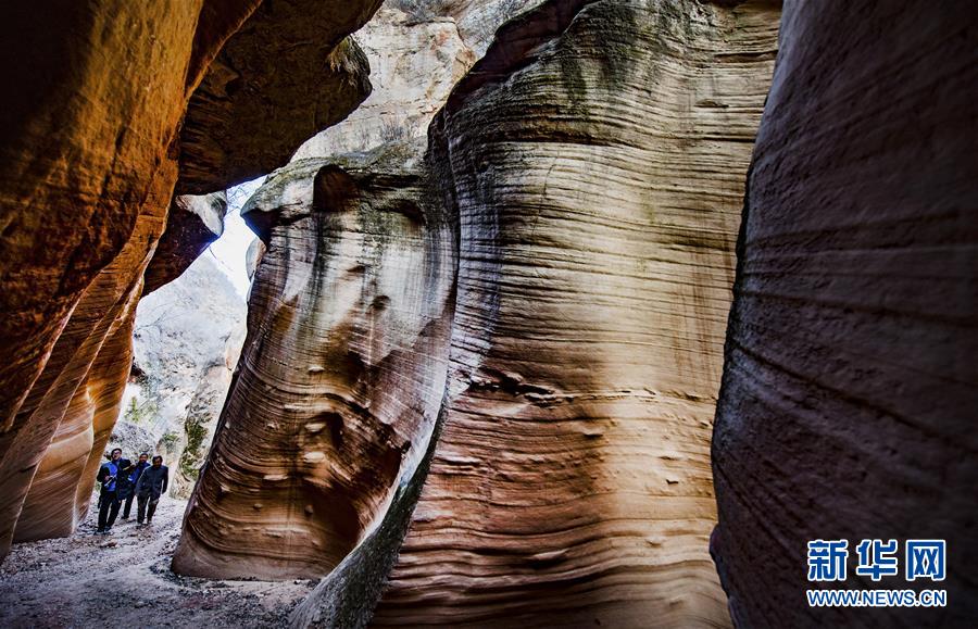 12月17日,游人在志丹县双河镇毛项峡谷内游览。 毛项峡谷位于陕西省延安市志丹县双河镇毛项村,峡谷全长12公里,分为9段,曲折绵延,谷内石壁凹凸不平,其中最窄处只能容一人侧身通过,堪称黄土高原上的自然奇观。 新华社记者 陶明 摄