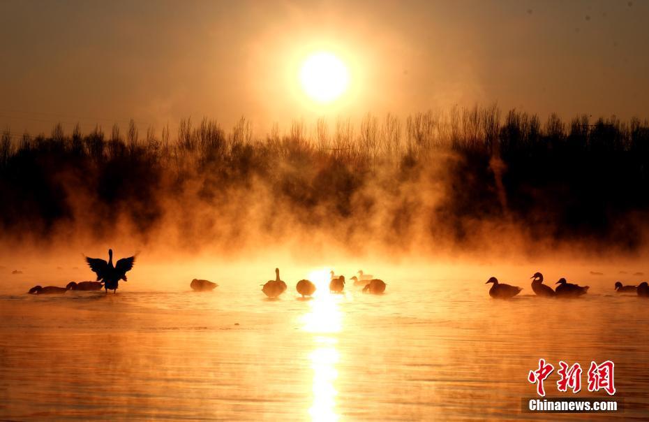 12月18日,辽宁省沈阳市,一群大雁在沈阳浑河栖息、觅食。入冬以来,沈阳浑河鸟岛附近栖息着大量的大雁等鸟类。由于流水底层水温比较高产生温度反差,河面上形成了一道雾气,大雁在水中栖息游弋,构成一幅生态美景图。 中新社发 黄金昆 摄 图片来源:Cnsphoto