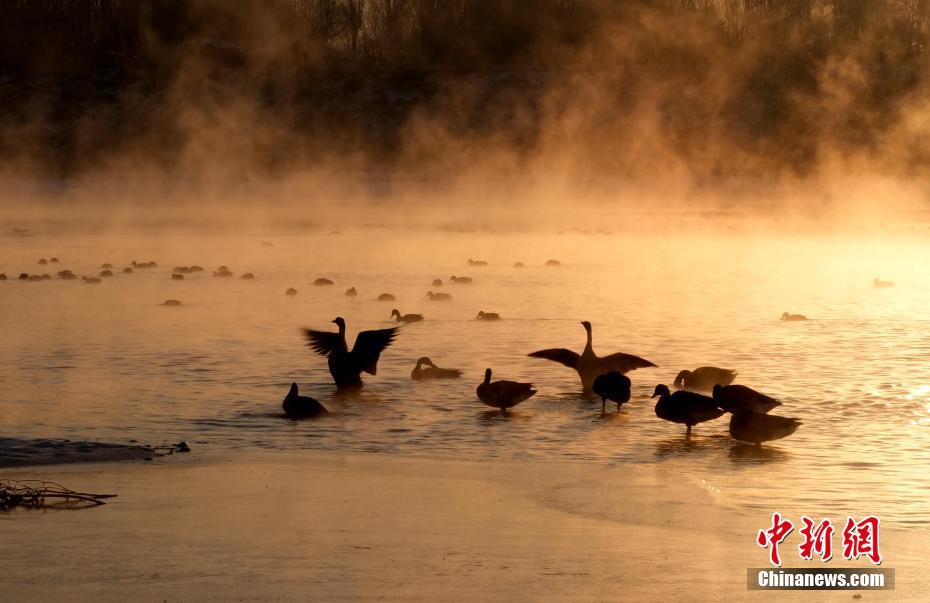 12月18日,辽宁省沈阳市,一群大雁在沈阳浑河栖息、觅食。入冬以来,沈阳浑河鸟岛附近栖息着大量的大雁等鸟类。由于流水底层水温比较高产生温度反差,河面上形成了一道雾气,大雁在水中栖息游弋,构成一幅生态美景图。 中新社发 黄金昆 摄 图片来源:Cnsphoto