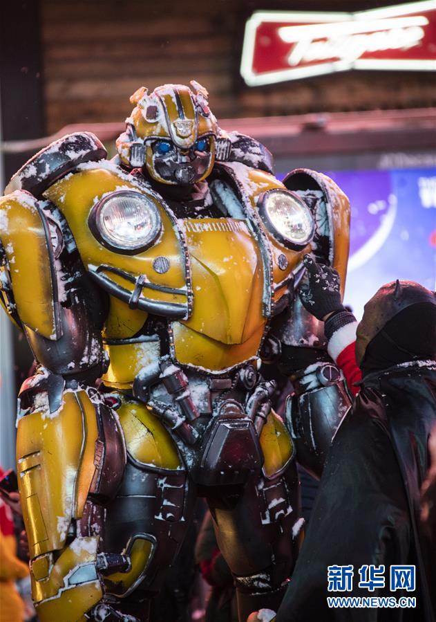 12月18日,在美国纽约时报广场,一名打扮成动漫人物的街头表演者为同伴清理积雪。新华社记者 王迎 摄
