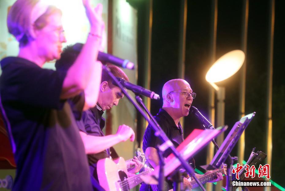近日,澳门人乐队在澳门美食节上演出。由土生葡人在1935年创立的澳门人乐队,曾有30名成员。左文轩1990年接手乐队,加以重组。目前乐队共有7名成员,5位是土生葡人。2008年,澳门特区政府授予乐队文化功绩勋章,表彰他们为推广本地文化艺术所做的努力。图为左文轩(右)在演出中。 中新社记者 张宇 摄
