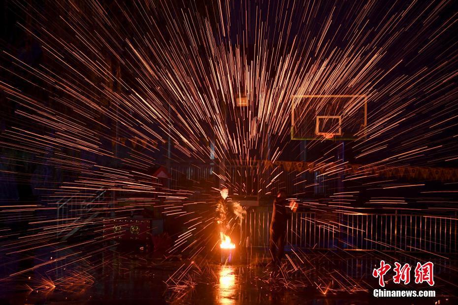 12月24日,工作人员击打铁花。当晚,国家非物质文化遗产“打铁花”在长沙石燕湖花灯节上演,现场呈现出“铁树银花落,漫天星辰开”的震撼场景。中新社记者 杨华峰 摄