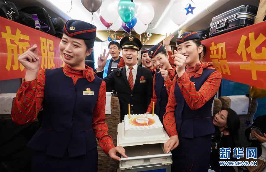 12月25日,列车乘务人员推出生日蛋糕。 2009年12月26日,武广高铁客运新干线正式开通运营,武汉至深圳北的G77次列车是首批开行的高铁班列之一。12月25日,中国铁路武汉局集团有限公司武汉客运段南线动车组车间的乘务员在列车上与乘客一起为G77次列车“庆生”。 新华社记者 程敏 摄