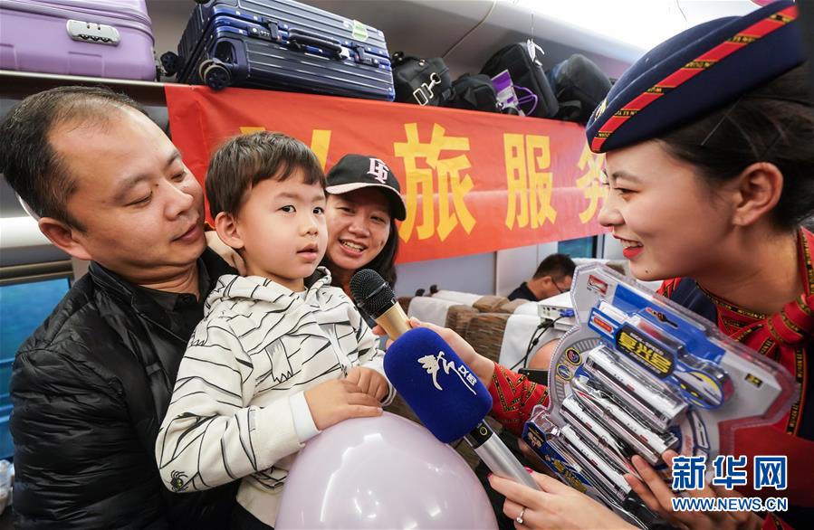 12月25日,乘务人员和小乘客互动。 2009年12月26日,武广高铁客运新干线正式开通运营,武汉至深圳北的G77次列车是首批开行的高铁班列之一。12月25日,中国铁路武汉局集团有限公司武汉客运段南线动车组车间的乘务员在列车上与乘客一起为G77次列车“庆生”。 新华社记者 程敏 摄