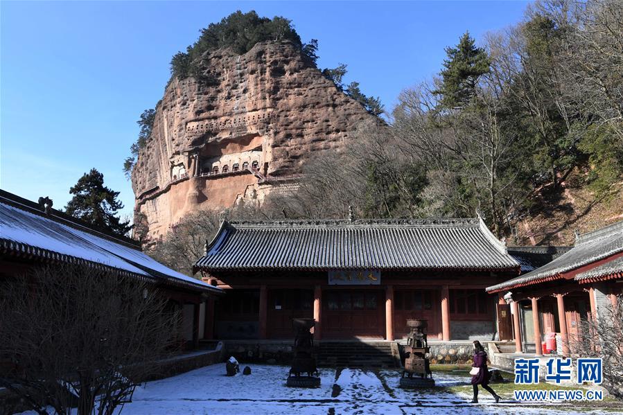 12月26日,游客在麦积山石窟参观游览。 一场降雪过后,位于甘肃省天水市的麦积山石窟在晴空下尤为壮美。麦积山石窟是中国四大石窟之一,因其山形似麦垛而得名,现存窟龛221座。 新华社记者 马宁 摄