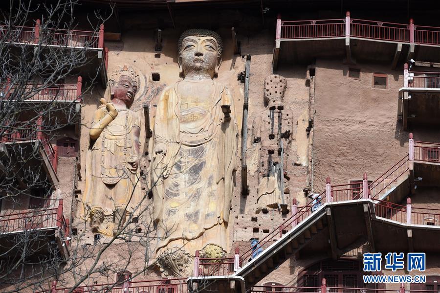 12月26日,游客在麦积山石窟参观游览。 一场降雪过后,位于甘肃省天水市的麦积山石窟在晴空下尤为壮美。麦积山石窟是中国四大石窟之一,因其山形似麦垛而得名,现存窟龛221座。 新华社记者 马宁 摄
