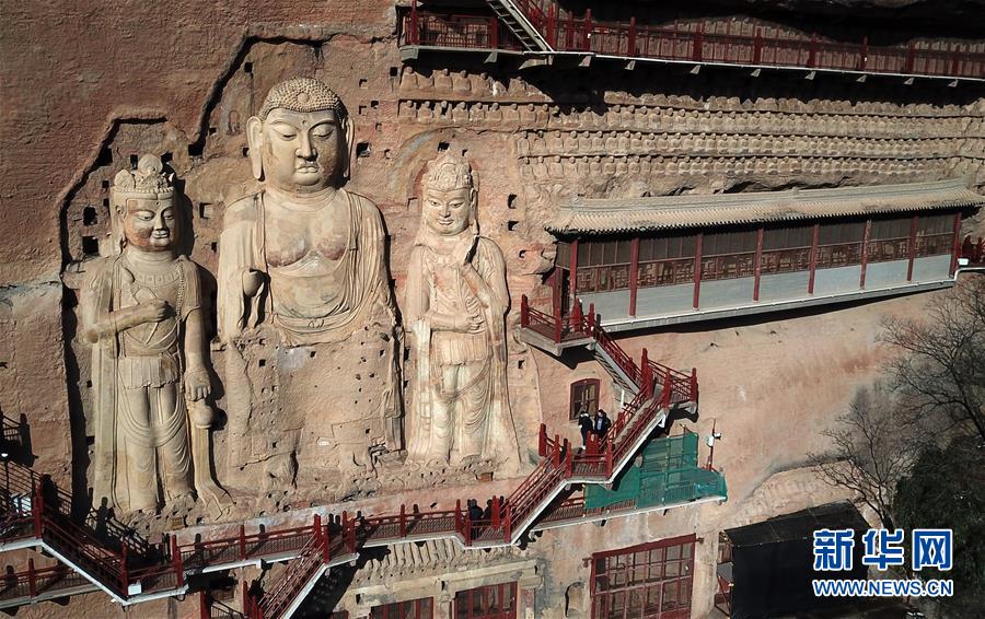 12月26日,游客在麦积山石窟参观游览(无人机拍摄)。 一场降雪过后,位于甘肃省天水市的麦积山石窟在晴空下尤为壮美。麦积山石窟是中国四大石窟之一,因其山形似麦垛而得名,现存窟龛221座。 新华社记者 马宁 摄