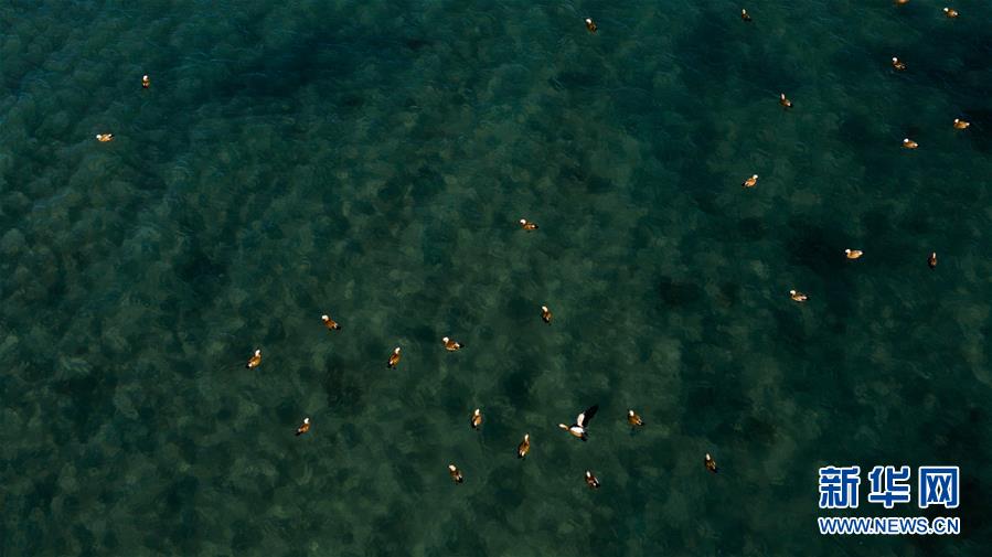 12月27日,一群赤麻鸭在青海湖未结冰的湖面游弋(无人机拍摄)。 12月中旬,青海湖开始出现结冰现象。据卫星遥感监测,目前青海湖结冰面积已超过湖体面积的10%,表明青海湖开始封冻。青海省气象局资料显示,今年青海湖封冻期与去年相比推迟7天,与近十年平均封冻期相比推迟了10天。根据青海湖周边4个气象站点的资料分析,气温升高是封冻期推迟的主要原因。 新华社记者 吴刚 摄