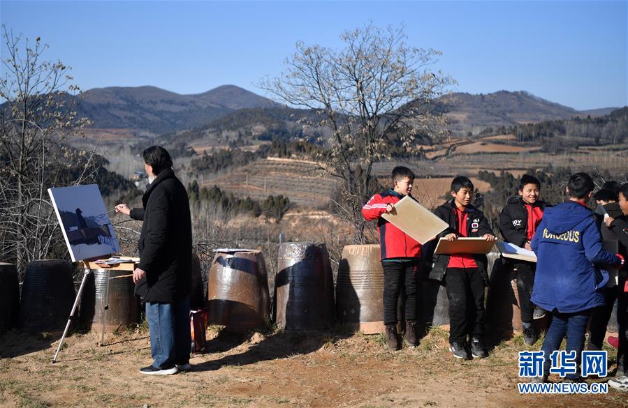 一名艺术家(左一)和洛宁县罗岭乡初级中学的学生们在洛宁县前河村进行绘画创作(12月29日摄)。新华社记者 李嘉南 摄