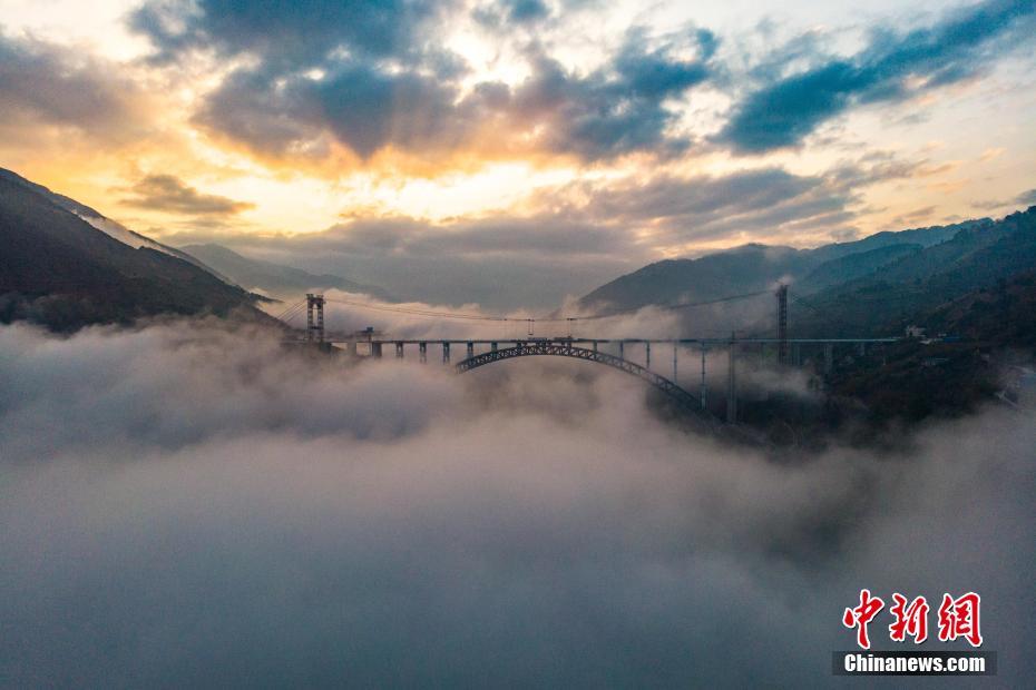 大瑞铁路怒江特大桥位于云南省保山市施甸县与龙陵县交界处,全长1024.2米,桥面宽度达25米,设计为四线车站桥。主跨采用490米钢桁拱,为世界铁路最大跨度。图为12月29日,航拍云雾缭绕的大瑞铁路怒江特大桥。中新社发 王一翔 摄
