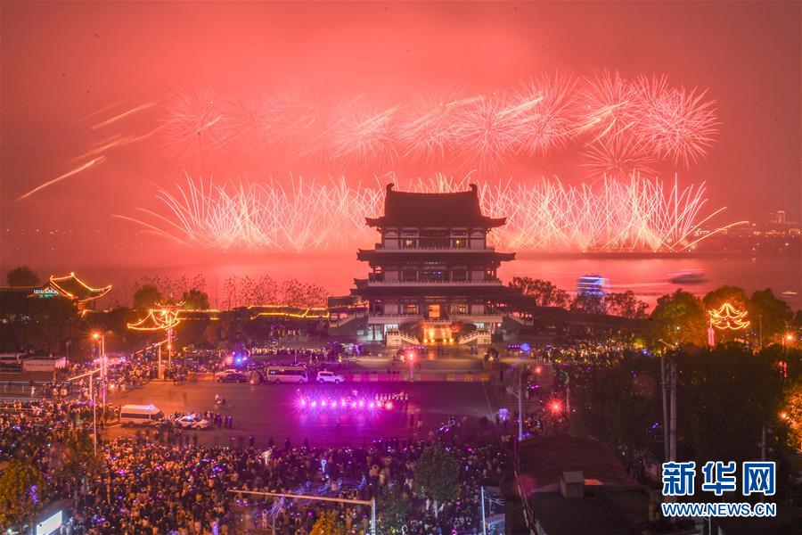 1月1日晚,市民和游客在湖南长沙杜甫江阁前观看焰火晚会。新华社记者 陈泽国 摄