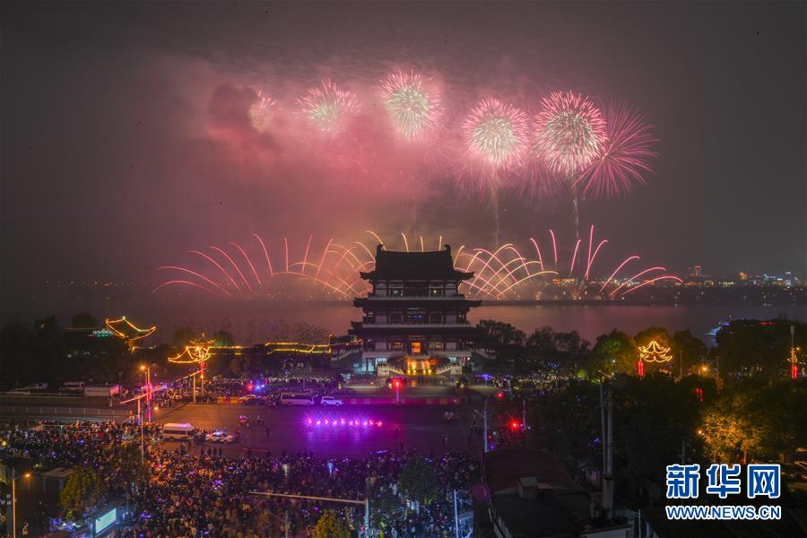 1月1日晚,市民和游客在湖南长沙杜甫江阁前观看焰火晚会。新华社记者 陈泽国 摄