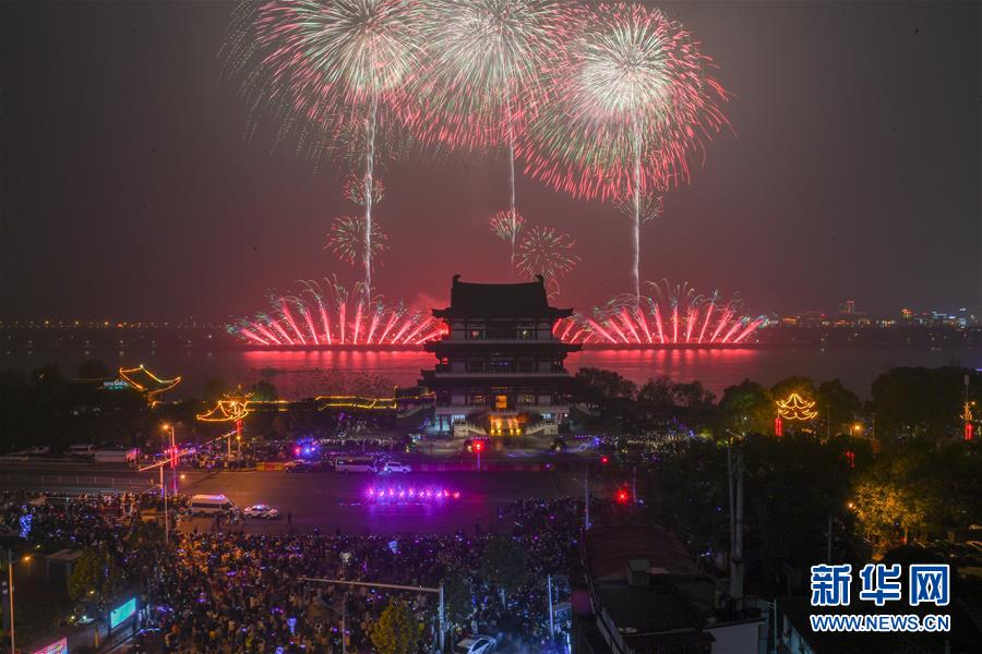 1月1日晚,市民和游客在湖南长沙杜甫江阁前观看焰火晚会。新华社记者 陈泽国 摄
