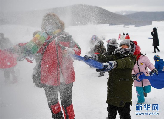 1月1日,游客参与泼雪迎新年活动。新华社记者 宋彦桦 摄