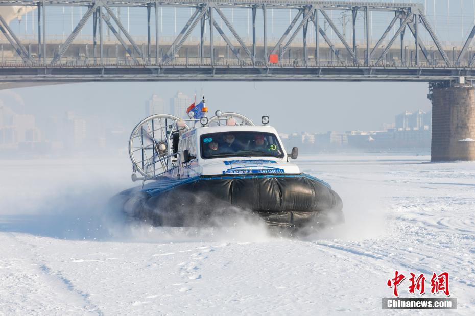 1月2日,一场“时尚冰河”巡游秀在黑龙江省哈尔滨市松花江冰雪嘉年华景区举行。中外游客在严寒中体验冰爬犁、冰滑梯、冰雪气垫船等冰雪娱乐项目。图为俄罗斯传统交通工具冰雪气垫船。中新社记者 吕品 摄