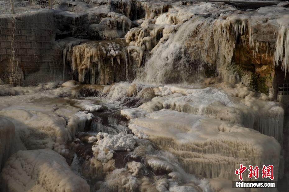 2019年1月1日,游客在山西省临汾市吉县黄河壶口瀑布欣赏“冰瀑玉壶”美景。随着冬季气温持续下降,位于晋陕交界的黄河壶口瀑布飞溅的浪花和水雾在瀑布两岸岩石上凝结形成冰瀑冰雕景观,晶莹剔透,造型别致,吸引了众多游客。中新社发 汪小英 摄 图片来源:CNSPHOTO