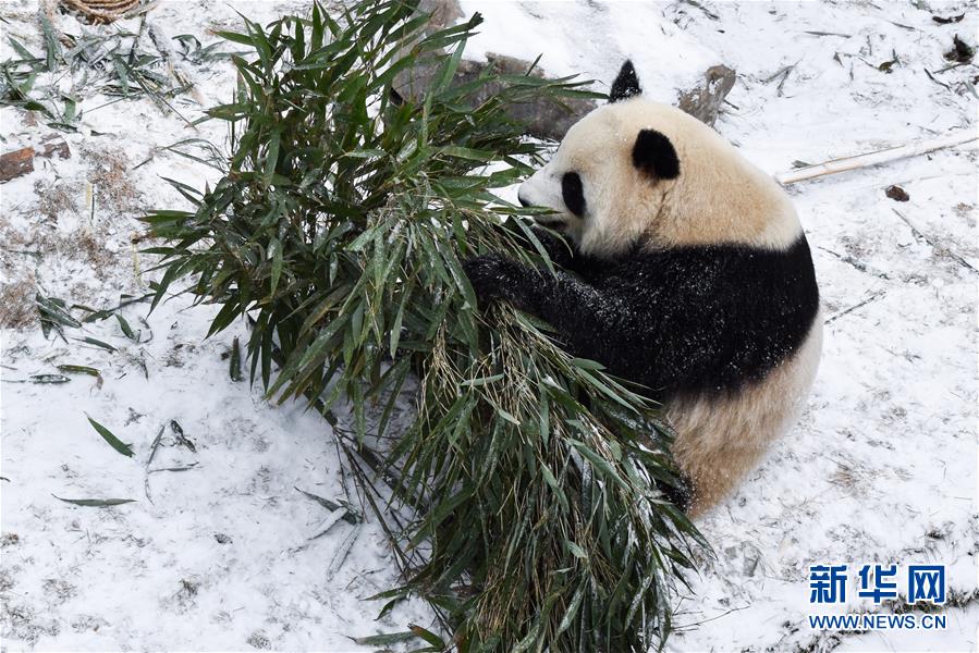 1月6日,在西宁市熊猫馆,一只大熊猫在吃竹子。 当日,青海省西宁市迎来2020年首场降雪,西宁市熊猫馆的大熊猫在雪中嬉戏。 新华社记者吴刚摄