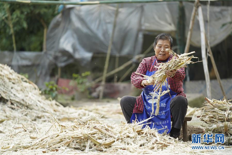 1月7日,重庆江津石蟆中坝岛上的居民在清理甘蔗渣。 长江入渝第一岛的重庆江津石蟆中坝岛,寒冬时节仍然呈现一派原生态的田园风光。 新华社记者 刘潺 摄