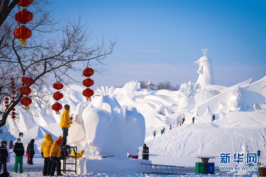 1月12日,参赛选手在进行雪雕创作。 当日,在哈尔滨太阳岛雪博会园区进行的第二十五届哈尔滨国际雪雕比赛进入第三天,来自10个国家和地区的参赛选手大秀技艺,各个雪雕作品已进入收尾阶段。 新华社记者王松摄