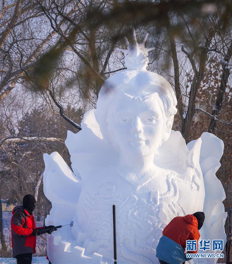 1月12日,参赛选手在进行雪雕创作。 当日,在哈尔滨太阳岛雪博会园区进行的第二十五届哈尔滨国际雪雕比赛进入第三天,来自10个国家和地区的参赛选手大秀技艺,各个雪雕作品已进入收尾阶段。 新华社记者王松摄