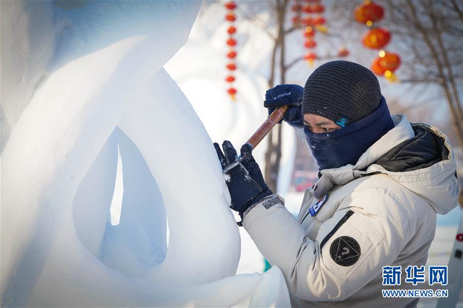 1月12日,参赛选手在进行雪雕创作。 当日,在哈尔滨太阳岛雪博会园区进行的第二十五届哈尔滨国际雪雕比赛进入第三天,来自10个国家和地区的参赛选手大秀技艺,各个雪雕作品已进入收尾阶段。 新华社记者王松摄