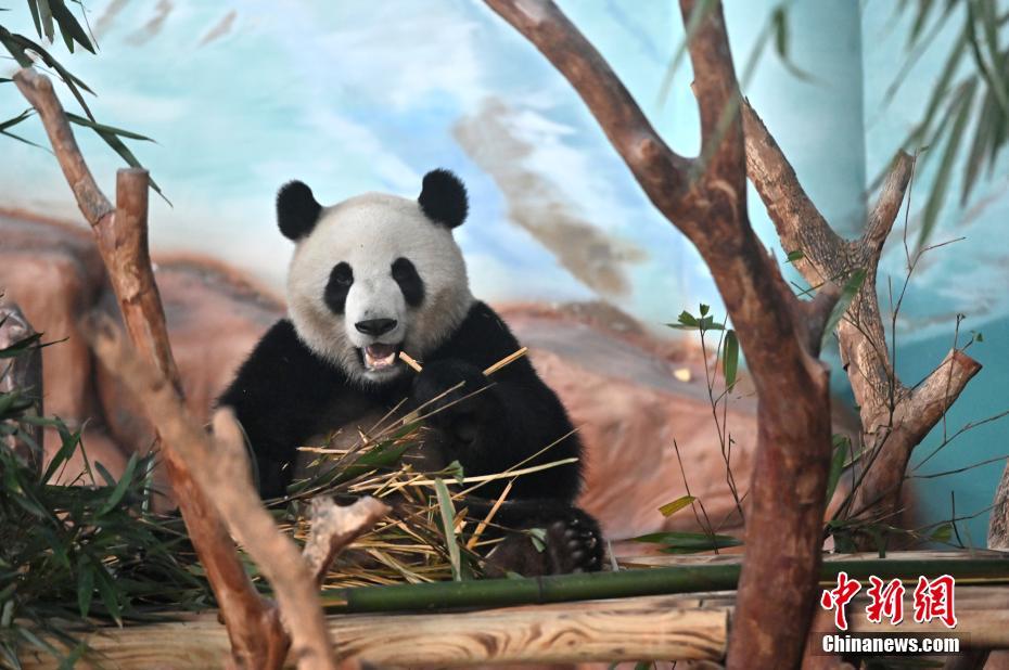 1月15日,大熊猫保护教育科普系列活动暨大熊猫苑开放仪式在南宁市动物园举行,来自成都大熊猫繁育研究基地的熊猫兄妹“绩美”和“绩兰”在大熊猫苑内正式亮相。熊猫兄妹俩出生于2016年6月27日,其父亲是成都首只旅美归国的明星大熊猫“美兰”,母亲是“绩丽”。熊猫哥哥“绩美”活泼好动,妹妹“绩兰”羞涩可爱。据了解,南宁市动物园大熊猫苑总面积达8360.42平方米,含熊猫活动场所、沉浸式智慧体验室、科普体验室等多个区域,向民众展示“国宝”熊猫的生活起居。图为熊猫哥哥“绩美”尽显吃货本色。 俞靖 摄