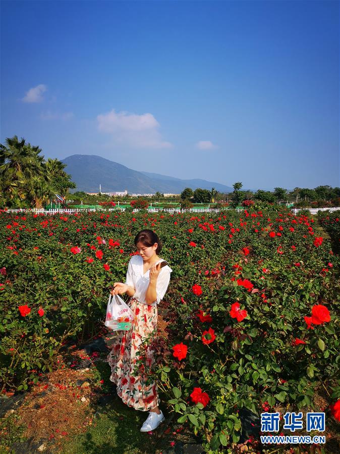1月16日,游人在三亚市吉阳区亚龙湾国际玫瑰谷赏花。 时下,海南省三亚市吉阳区亚龙湾国际玫瑰谷鲜花盛开,吸引游客前来参观游览。 新华社发(许建园 摄)